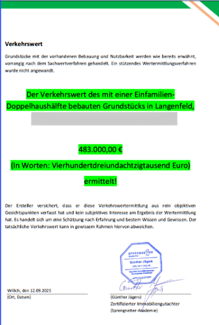 Klar ausgewiesener Verkehrswert mit vollständiger Herleitung. Annahmen und Datenquellen sind transparent dokumentiert.